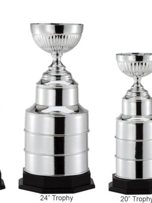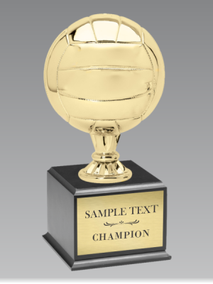 A full metal cup mounted on a black wood base, available in several sizes. The base includes a custom engraved plate that can feature full-color logos, images, or personalized text. This trophy can also be used as a perpetual award by adding side plates for additional engraving.