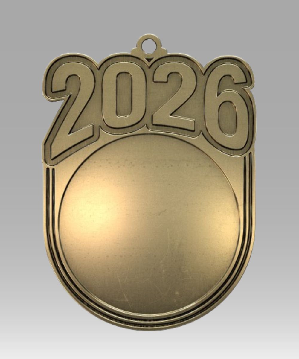 3″ Die Cast 2026 Insert Medal Holds 2″ Custom Mylar. Free Artwork and Setup. Neck Ribbon Included.
