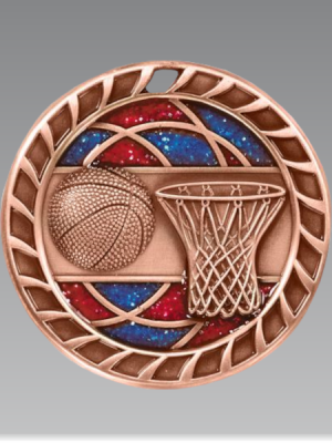 2.5″ DIE CAST BASKETBALL GLITTER MEDAL. AVAILABLE IN GOLD, SILVER OR BRONZE. NECK RIBBON INCLUDED