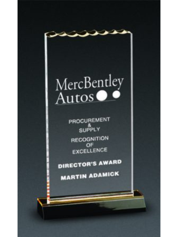 3/4″ Thick Clear Acrylic with either a Rich Blue or Gold Mirrored base. Available in Three Sizes