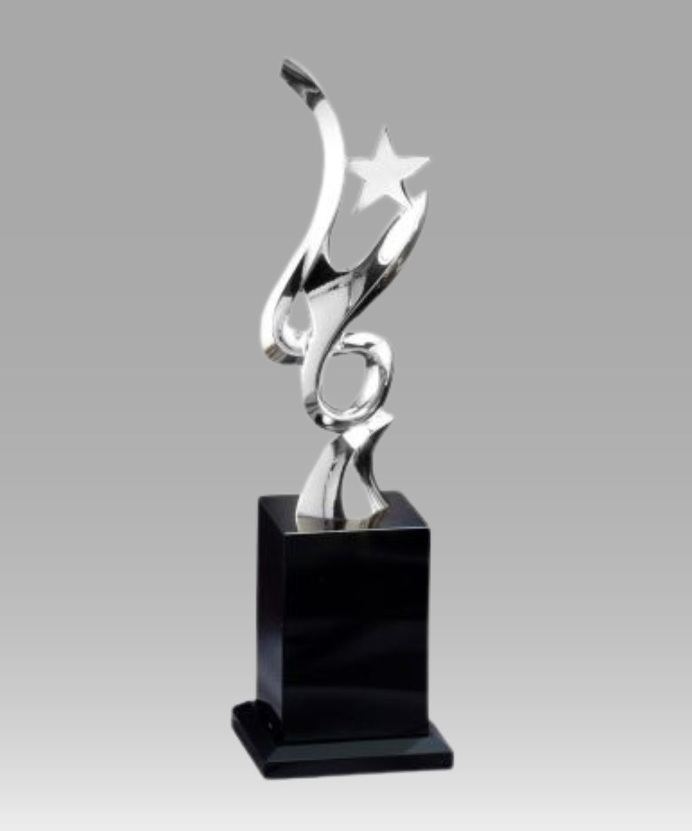 This striking 13 inch Metal and Crystal Art Deco Star Award blends a sleek metal figure mounted on a black crystal base for a bold, modern presentation. A sculpted star element highlights achievement, while clean geometric lines and polished finishes create timeless appeal. Perfect for corporate recognition, leadership honors, and milestone achievements, with generous space for custom engraving