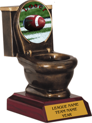 Last Place Toilet Bowl Trophy with 2″ Insert Holder. Rubber Turd resting on top. Perfect for Fantasy Football Loser