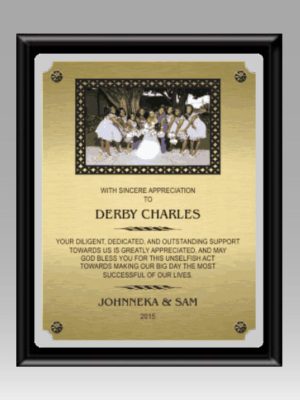 Our Most Popular Printed Picture Plaque. Picture Printed Directly On White, Gold or Silver Metal With a Trim Plate (you choose color) on a Black Walnut Finished Plaque Board. Simply Upload Your Photo, image or logo!! 3 Sizes to choose from