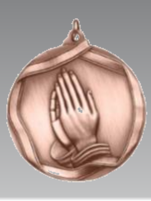 2.25″ Die Cast Praying Hands Religious Ribbon Medal. Available in Gold, Silver and Bronze. Neck Ribbon included