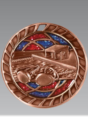 2.5″ Die Cast Swimming Glitter Medal. Available in Gold, Silver, Bronze. Neck Ribbon Included